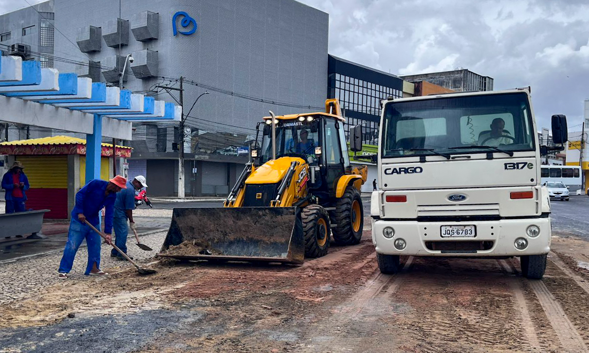 As equipes da Secretaria Municipal de Manutenção (Seman) atuaram nas localidades da Nova República, Ponto do Beiju, Uruba, Olhos d’Água, Estevão, Vila São João, Cajazeira, Baixa da Candeia, Marechal Floriano e Centro da cidade. As ações incluíram colocação de material e fechamento de valetas, reparos, sucção e limpeza nas redes de drenagem e esgoto, recomposição de paralelepípedos, além de varrição e limpeza de vias.